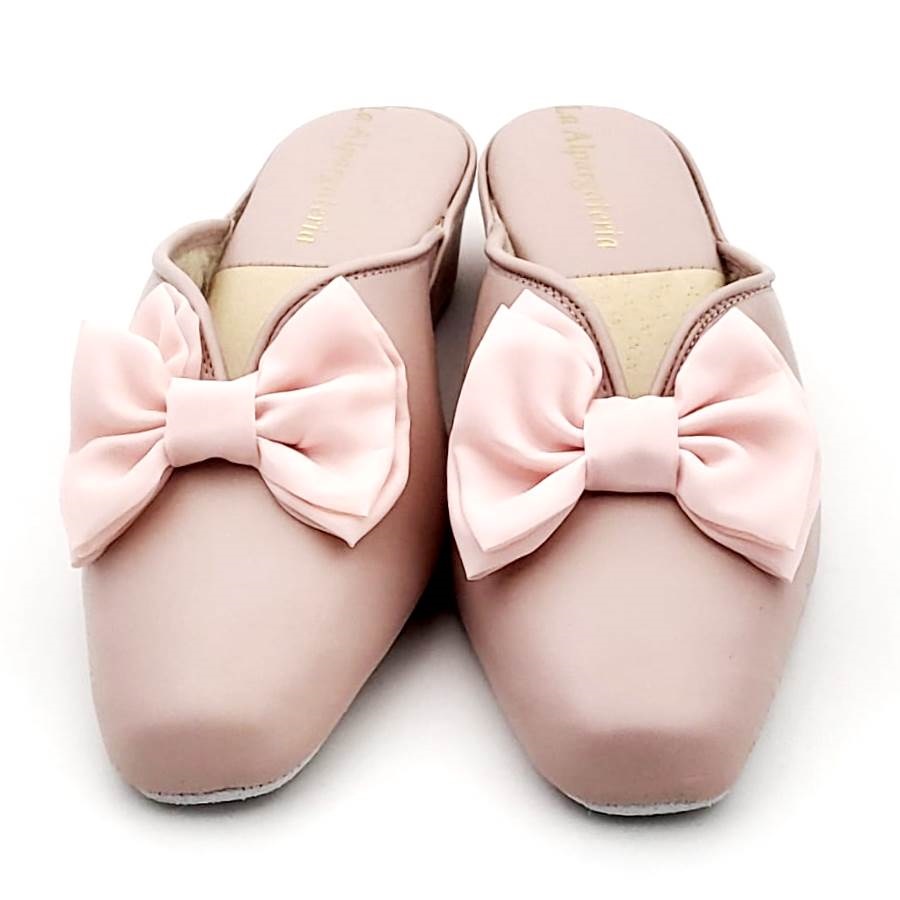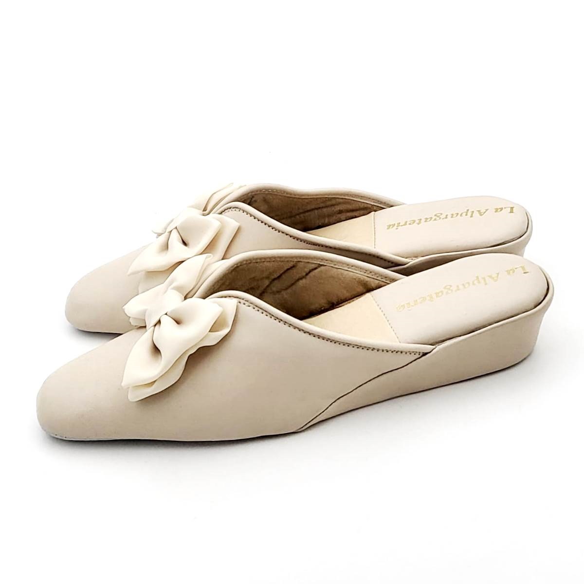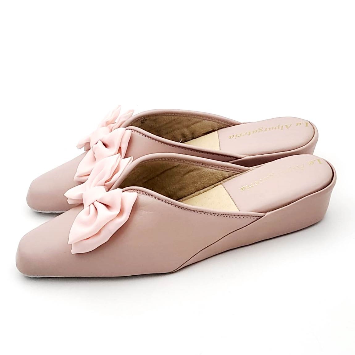 Preciosa nueva zapatilla de piel napa con un poco de tacón 3 cm y con suela silenciosa de badana para evitar los ruidos tan molestos al caminar es practica a la vez que duradera y sana para los pies por sus excelentes materiales , fabricada en ESPAÑA totalmente esta disponible en cinco colores a cual mas bonito . Esta zapatilla esta descubierta por el talón y tiene la peculiaridad de llevar un lazo de tela grande en el empeine haciendo que sea super elegante ideal para estar en casa y también para regalar en cualquier ocasión ¡acertarás seguro !