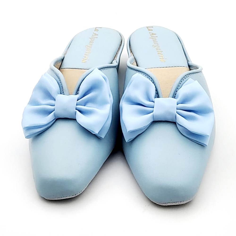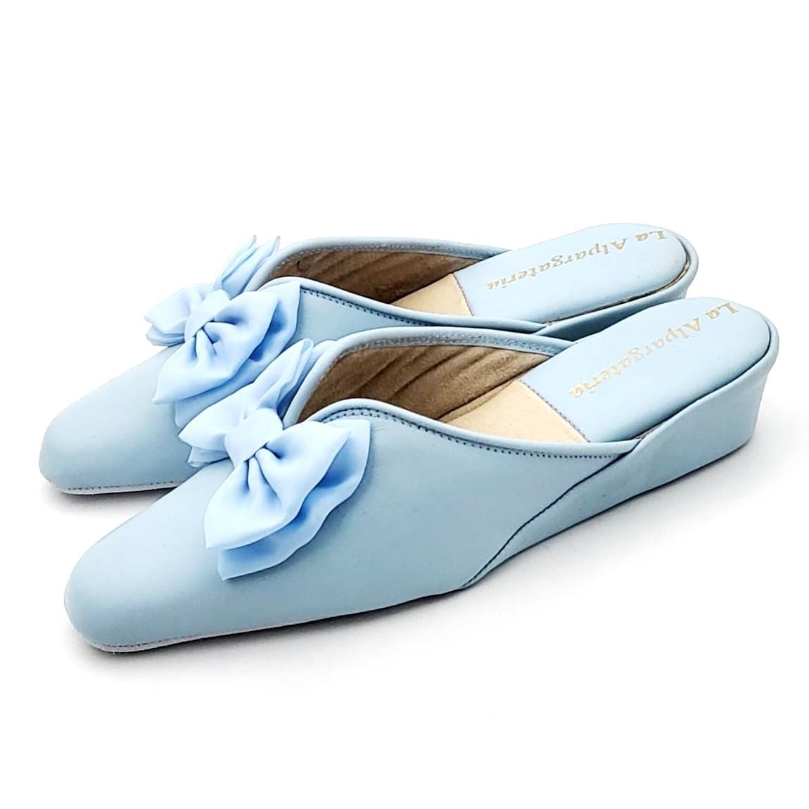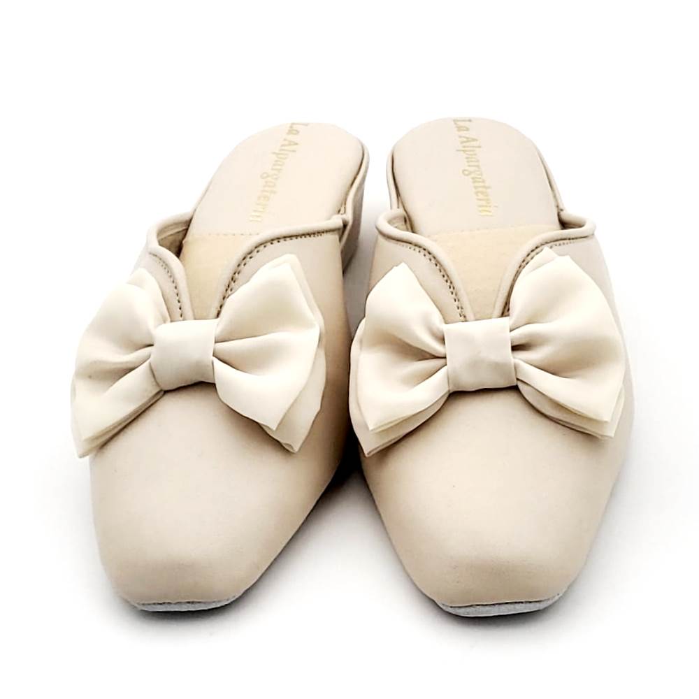 Preciosa nueva zapatilla de piel napa con un poco de tacón 3 cm y con suela silenciosa de badana para evitar los ruidos tan molestos al caminar es practica a la vez que duradera y sana para los pies por sus excelentes materiales , fabricada en ESPAÑA totalmente esta disponible en cinco colores a cual mas bonito . Esta zapatilla esta descubierta por el talón y tiene la peculiaridad de llevar un lazo de tela grande en el empeine haciendo que sea super elegante ideal para estar en casa y también para regalar en cualquier ocasión ¡acertarás seguro !