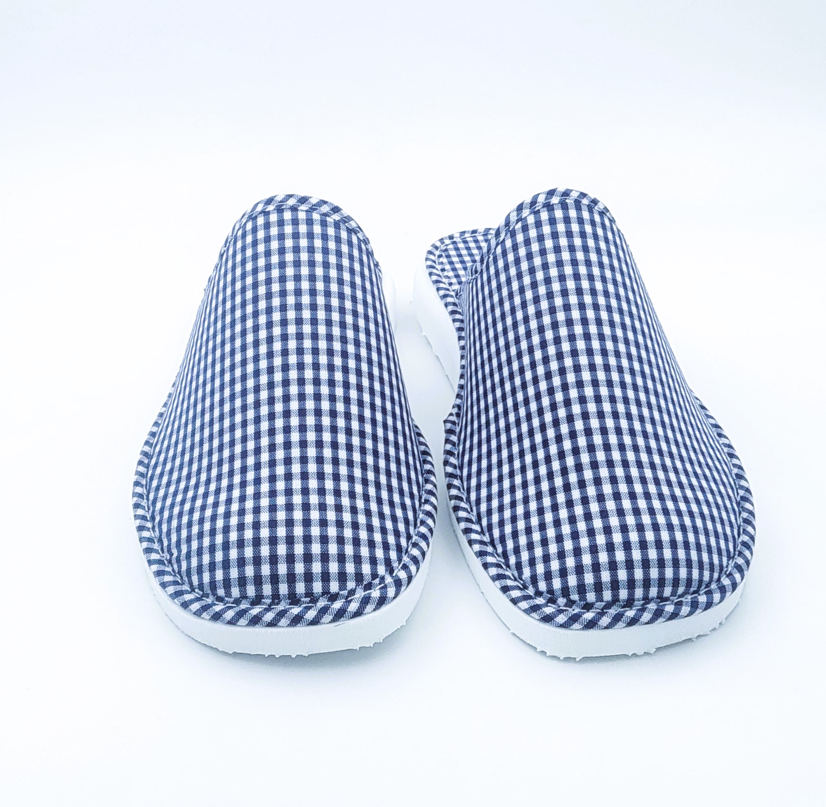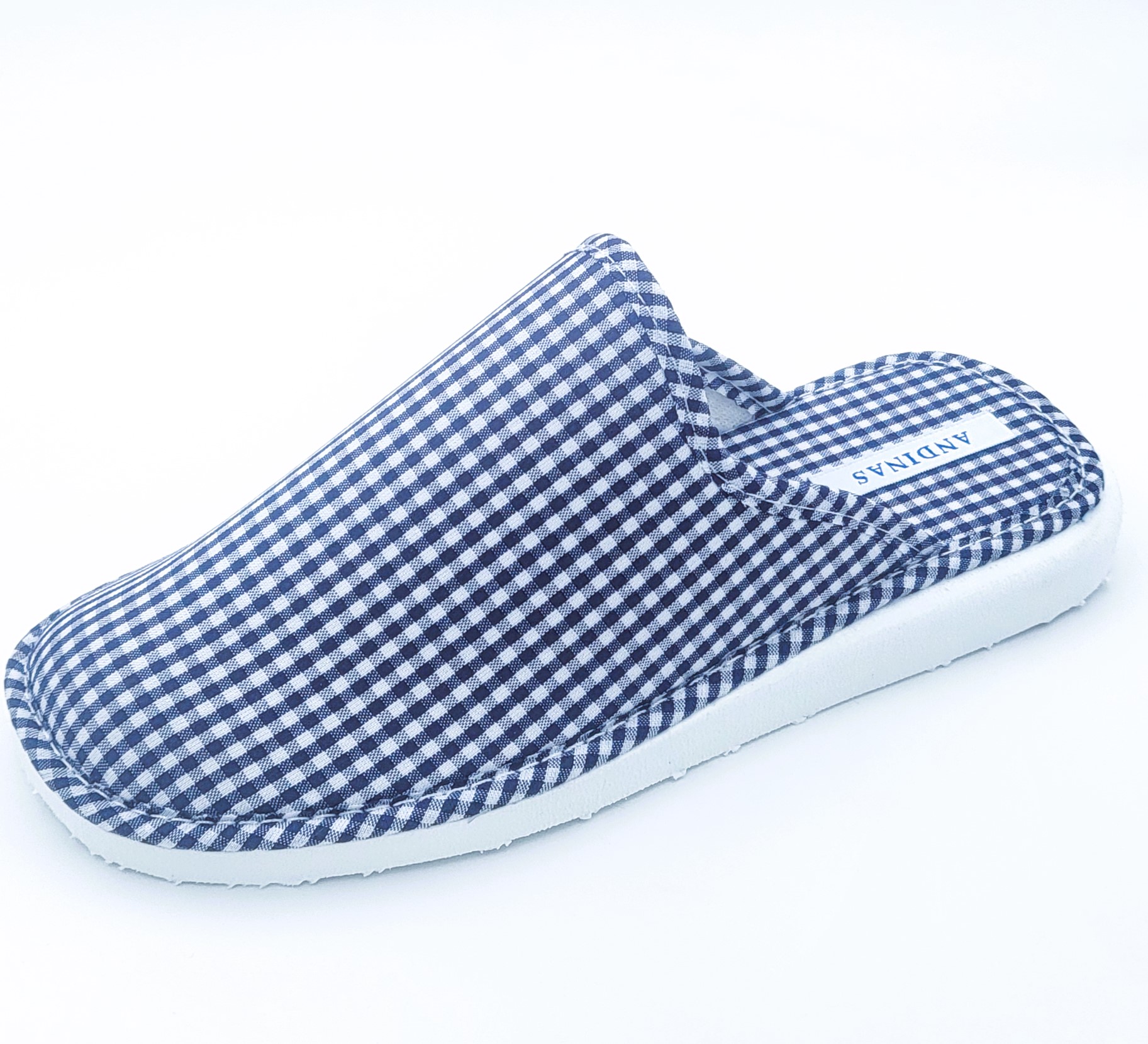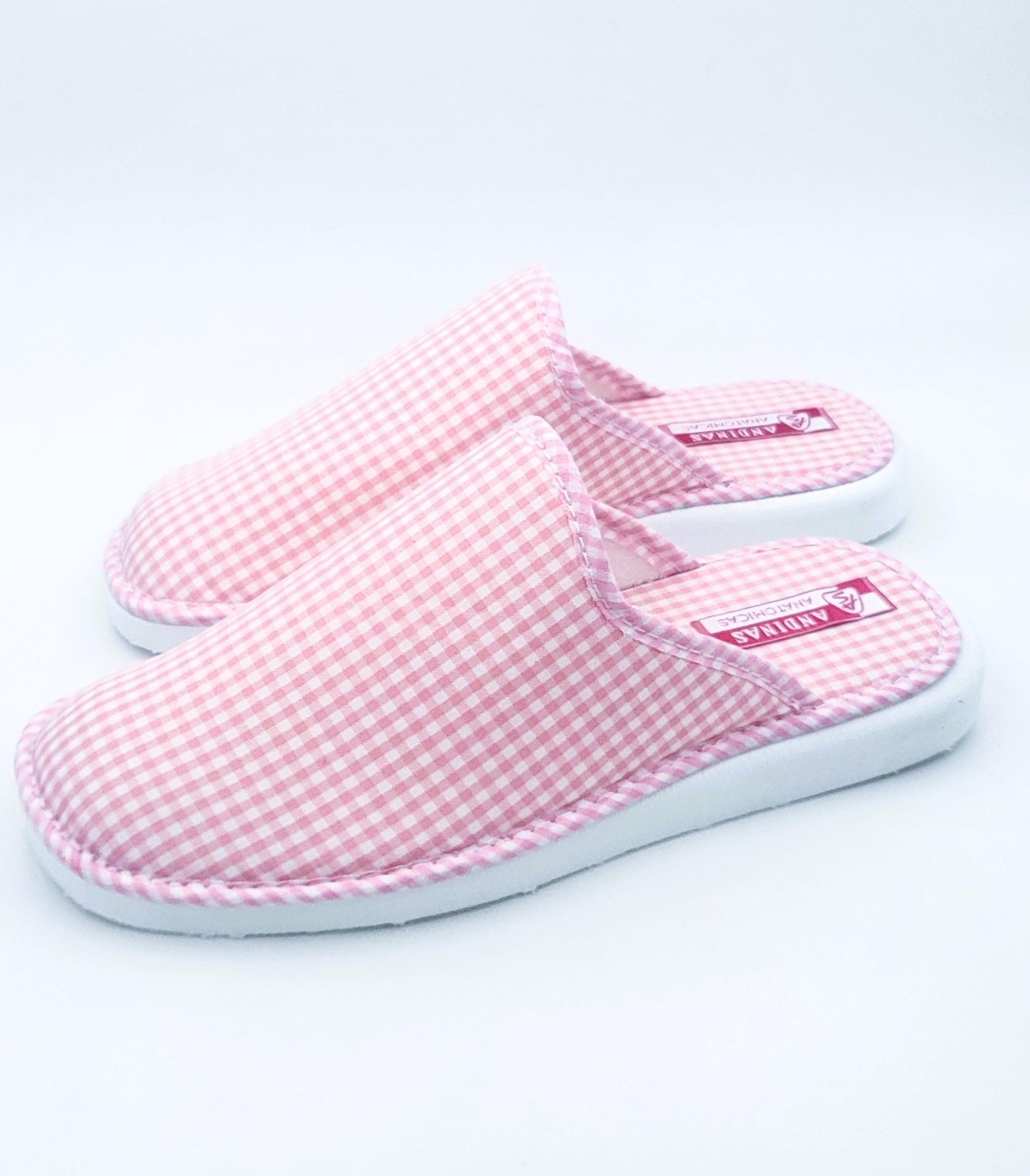 Zapatillas de casa de verano con suela micro porosa fabricadas en algodón 100% descalzas con estampado de cuadros vichy azul con cuadro blanco o rosa con cuadro blanco destalonadas o llamadas descalzas por detrás.