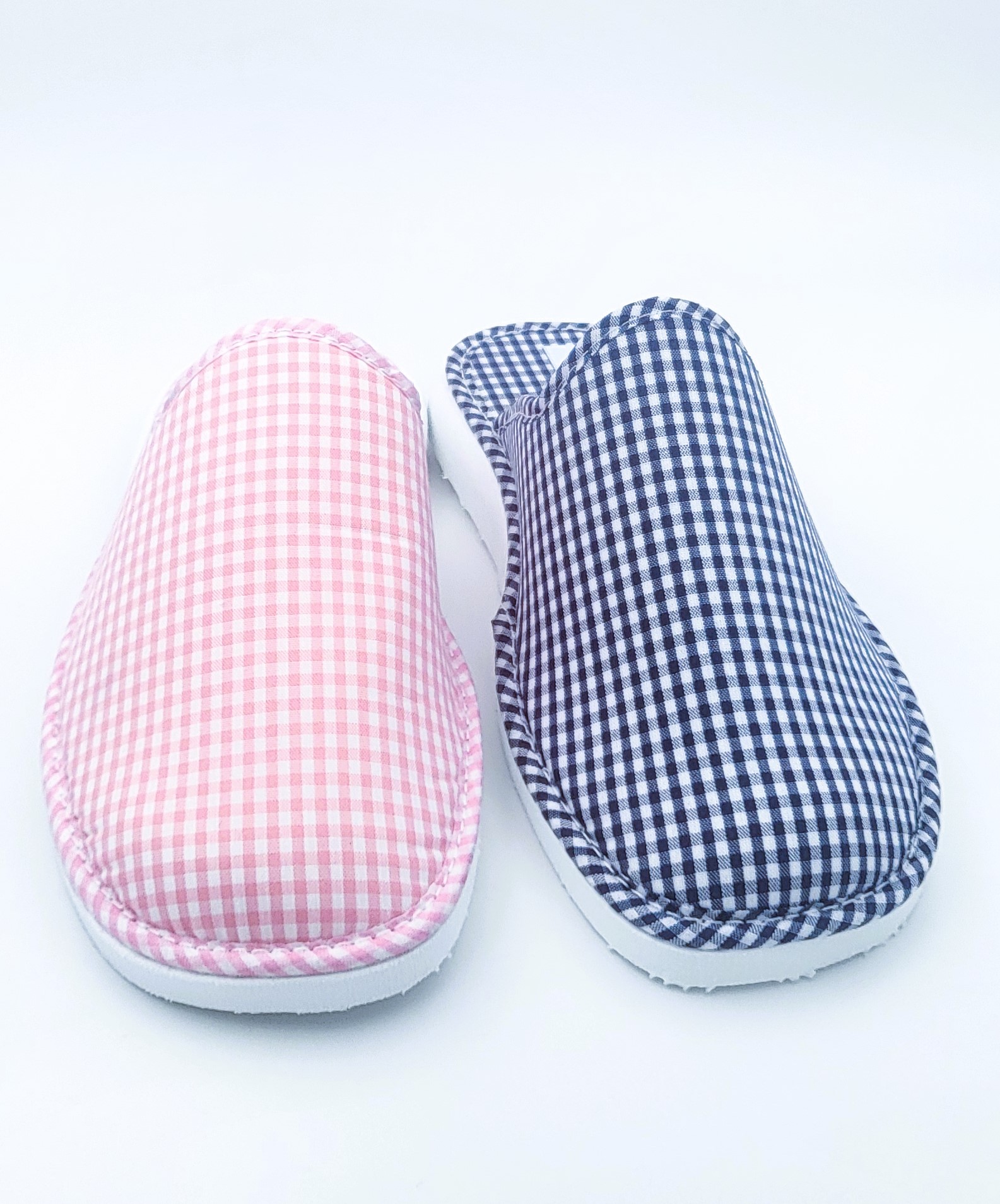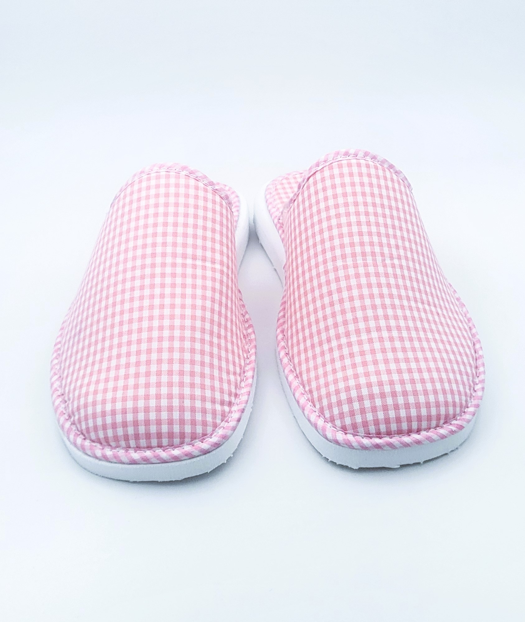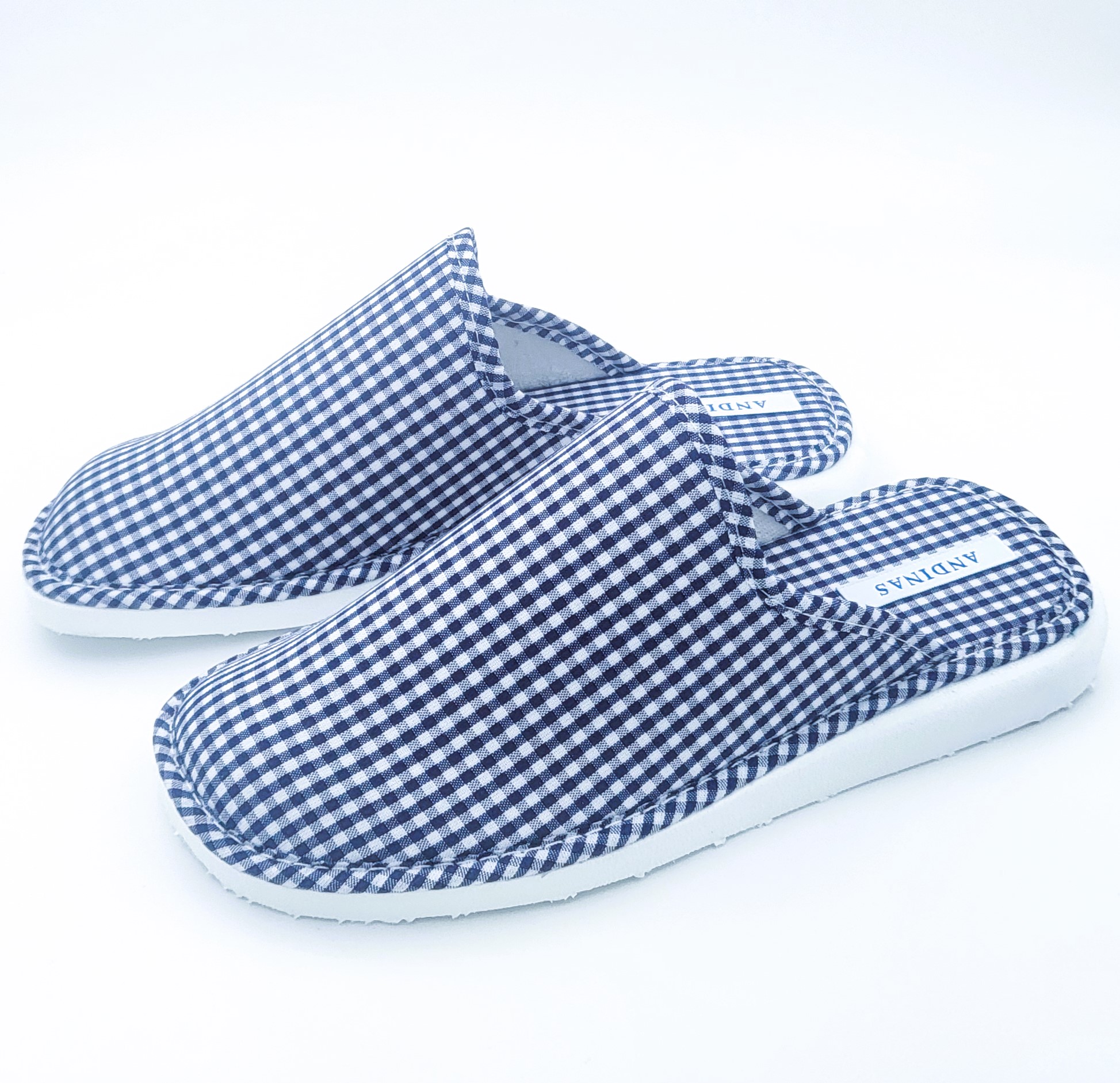 Zapatillas de casa de verano con suela micro porosa fabricadas en algodón 100% descalzas con estampado de cuadros vichy azul con cuadro blanco o rosa con cuadro blanco destalonadas o llamadas descalzas por detrás.