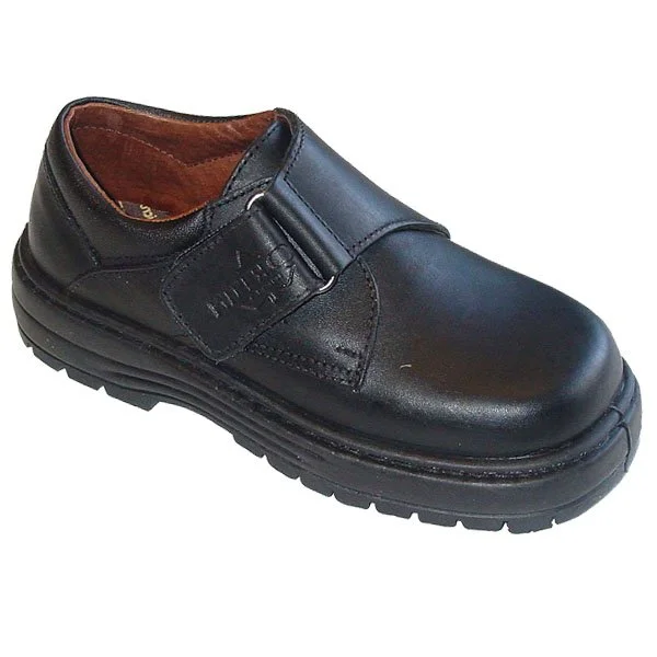 Zapato de niño colegial en piel y con velcro, con plantilla de tela extraible y forro de piel. Cosido a la vira con piso tacos.